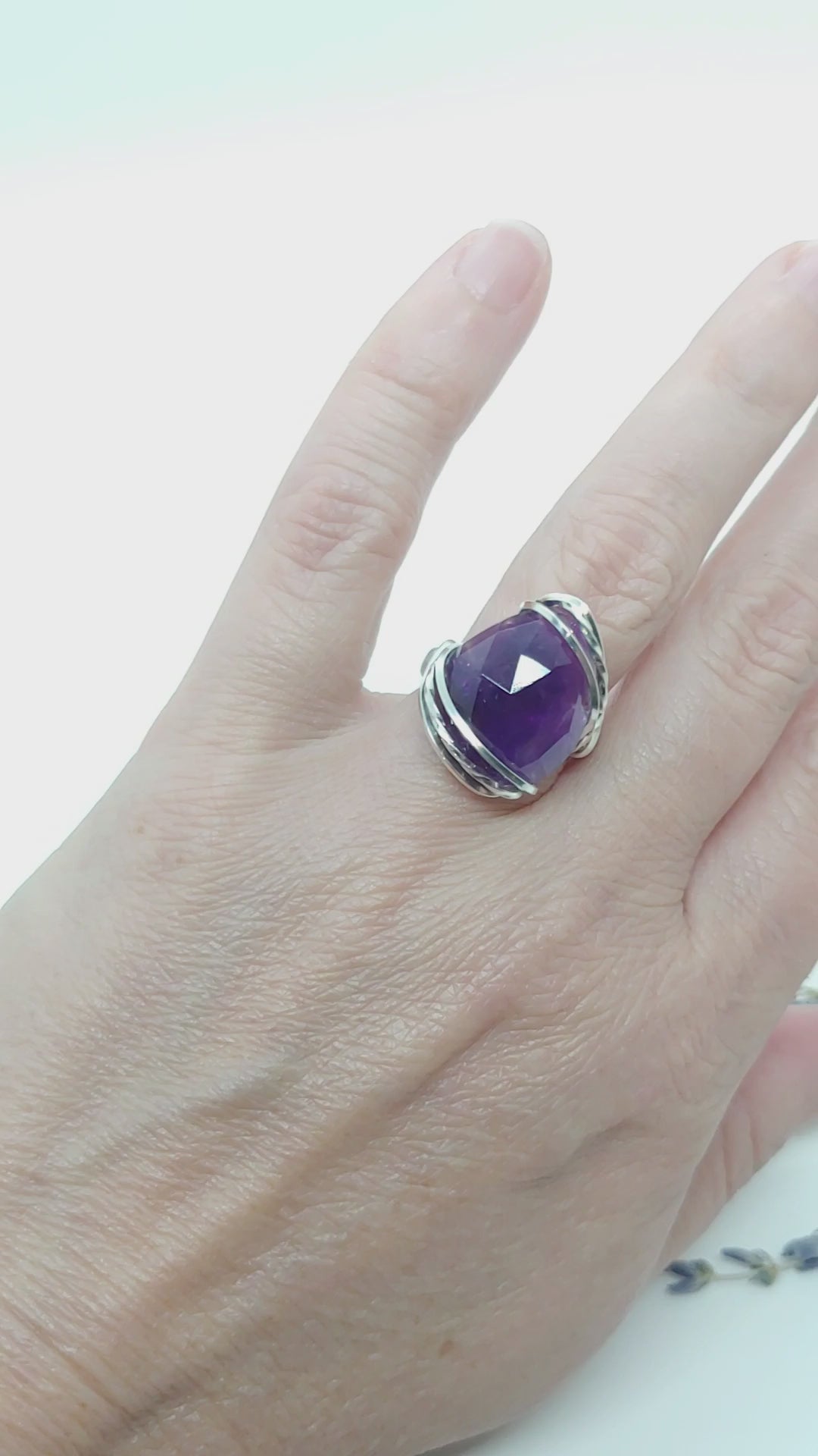 - Faceted pear Amethyst cabochon wrapped in sterling silver